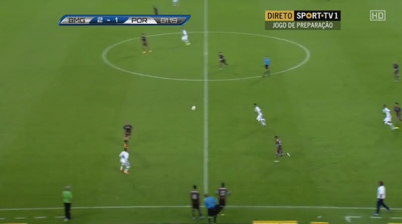 Esta foi uma das grandes diferenças entre a primeira e a segunda parte. Um jogador mais vertical, capaz de fazer movimentos de rotura. Algo que Evandro não era e que Tello pouco fez. Apesar de tudo, pessoalmente prefiro que a jogada se desenvolva de outra forma. O extremo dá apoio interior e cria-se um 1x2x1 fácil com o lateral a encarar, de frente, a área adversária. Aqui, nesta situação, Varela pode ganhar a bola mas está de costas e pressionado uma vez que o central do Borussia está a fazer a dobra.